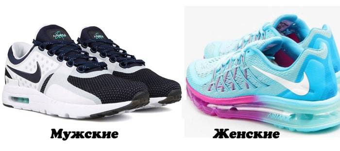 Оттенки верха и подошвы. Женские кроссовки изготавливают в разном цветовом исполнении. Преобладают яркие, контрастные расцветки или наоборот – нежные, пастельные. Иногда верх обуви дополняют разноцветные узоры, орнаменты, веселые принты. В мужской версии нет такого буйства красок: в цветовой гамме чаще лидируют 2-3 стандартных тона (черный, серый, коричневый). Внешне обувь более практичная, т.к. часто используется для тренировок, прогулок и даже деловых встреч. Размерная сетка. В ассортименте кроссовок для девушек сложно обнаружить модель больше 40-го размера, это объясняется физиологией. Типичный размеры взрослых «кроссов» – от 37 до 40. Мужская обувь представлена в большем размерном ряде, вплоть до 45-го. Ширина колодки. Передняя часть стопы у женщин шире, чем область пятки. С учетом этого создаются кроссовки с зауженной колодкой