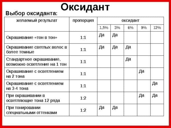 Выбор необходимого оксида имеет значение в том случае, когда происходит осветление волос. При окрашивании в тона темнее имеющегося цвета волос применяется окислитель с низкой концентрацией 1.5% или 3%. Руководствоваться можно таблицей.