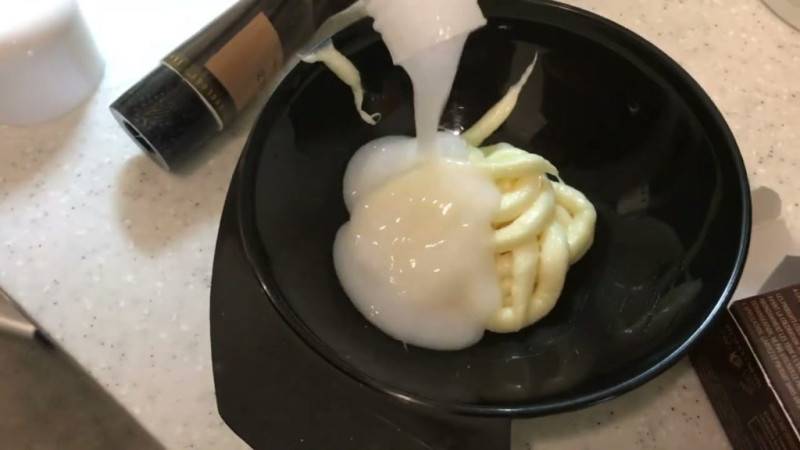 - В емкость засыпь пудру или порошок. Залей окислитель. Выдерживай пропорцию 1:2 (где 1 – порошок, 2 – окислитель).