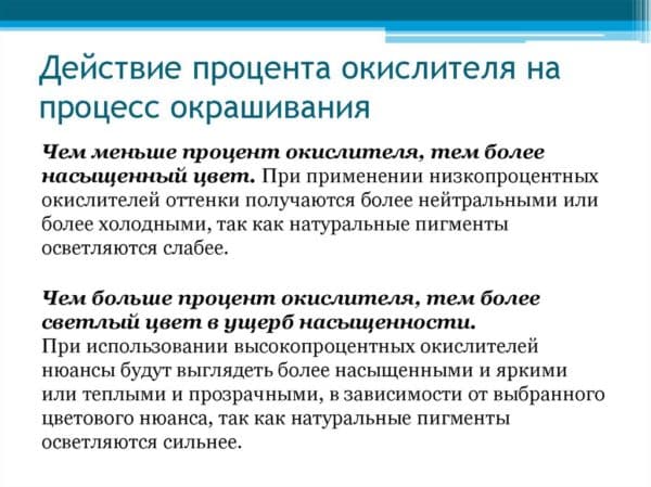 Цель окрашивания и тип волос определяют выбор окислителя.
