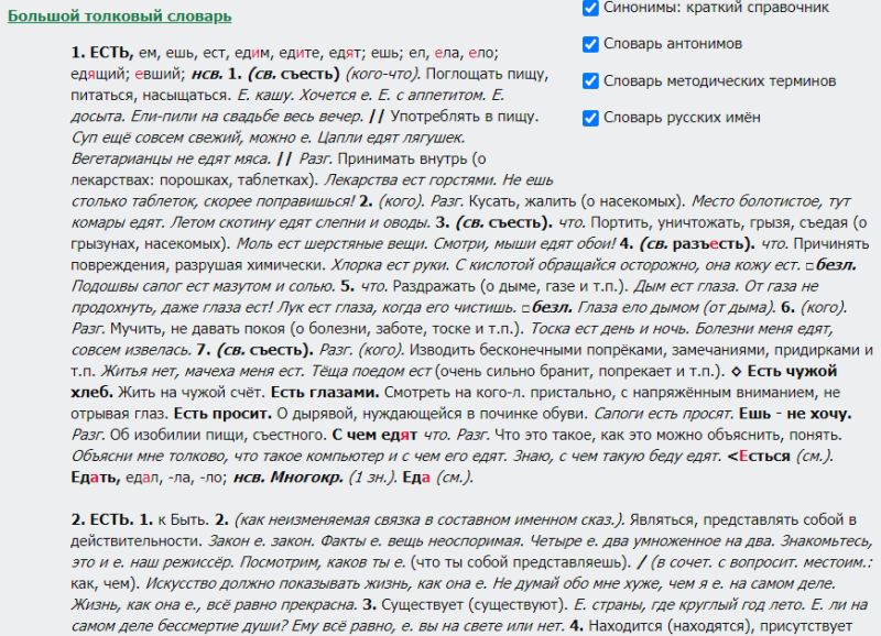 И еще. Слово может быть многозначным и при этом иметь омонимы. Например, «есть» в значении «съедать» и в значении «быть, находиться». Это омонимы, но каждый из них имеет несколько значений: