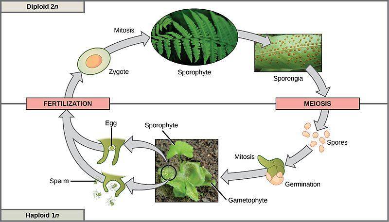 Папоротники же размножаются при помощи спорангиев, которые образуются на нижней стороне листьев. Спорангии содержат споры — гаметофит, который в процессе развития дает начало новому папоротнику. Жизненный цикл папоротников сложнее, чем у мхов, включая две основных фазы — спорофит и гаметофит. Спорофит — это видимая нам растительная особь, которая образуется из зиготы, образованной сплетением гамет гаметофита. Гаметофиты папоротников обычно очень маленькие и невидимы без увеличения.
