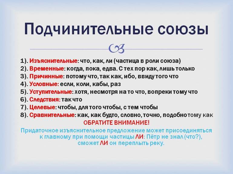 В таблице приведены примеры подчинительных союзов в русском языке списком: