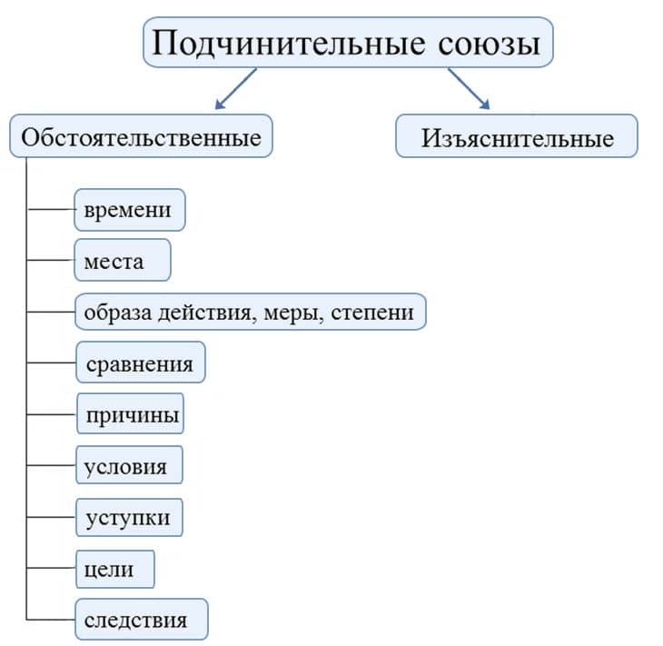 | Причинные | Вследствие, потому что, из-за того что, ввиду того что | Я не выполнил домашнее задание, потому что не понял темы прошлого урока. Ввиду болезни я не поехал с классом на экскурсию. |