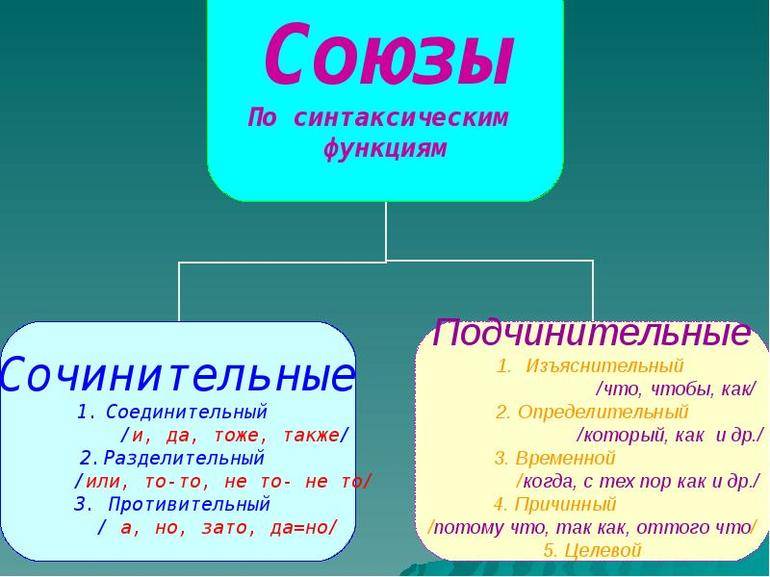 Функция (роль) союзов – выражение синтаксических связей: сочинительных и подчинительных.