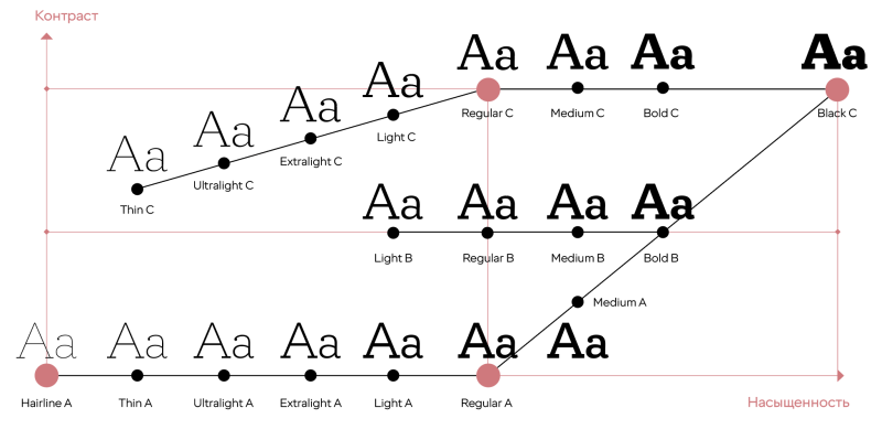 Структура прямых начертаний шрифтовой системы Circe Slab с тремя градациями по контрасту: A — неконтрастные, B — малоконтрастные, C — контрастные
