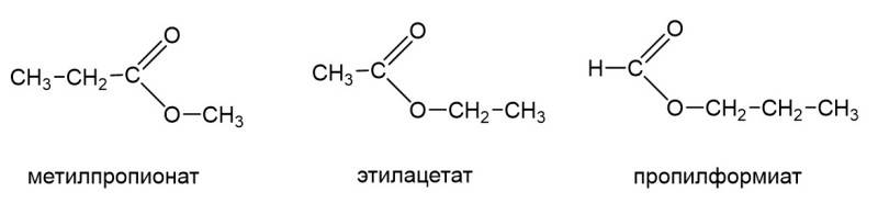Также возможна изомерия положения сложноэфирной группы –СO–O–, то есть когда число атомов углерода в сложном эфире постоянно, а сложноэфирная группа смещается по углеродной цепи. Три таких изомера показаны ниже: