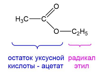 Название сложных эфиров образуется из двух частей: сначала называется радикал, который заместил водород в карбоновой кислоте, а потом называется кислотный остаток кислоты. Поэтому когда перед глазами есть структурная формула сложного эфира, необходимо выделить радикал и фрагмент кислотного остатка, после чего назвать их. На рисунке ниже мы можем выделить остаток уксусной кислоты, имеющий название «ацетат», и радикал «этил». Соединив два слова, получим название сложного эфира – этилацетат.
