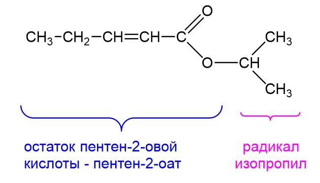 Кислотный остаток здесь образован пентен-2-овой кислотой и называется он пентен-2-оат. А радикал у нас изопропиловый. Соединяем названия радикала и кислотного остатка и получаем: изопропилпентен-2-оат. Такие сложные эфиры вряд ли встретятся в ЕГЭ, разве что в задании на отнесение веществ к классам органических соединений. Но главное понимать принцип того, как составлять их названия.