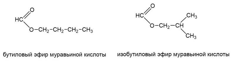 Это изомеры, кислотный остаток в одном случае имеет неразветвленный, а другом разветвленный углеродный скелет. То же самое с радикалом. Может быть бутиловый эфир муравьиной кислоты, а может быть изобутиловый эфир муравьиной кислоты.