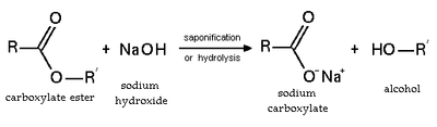 Этерификация — обратимая реакция. Сложные эфиры подвергаются гидролизу в кислотных и основных условиях. В кислых условиях реакция является обратной реакцией этерификации Фишера . В основных условиях гидроксид действует как нуклеофил, а алкоксид — уходящая группа. Эта реакция — омыление — лежит в основе мыловарения.