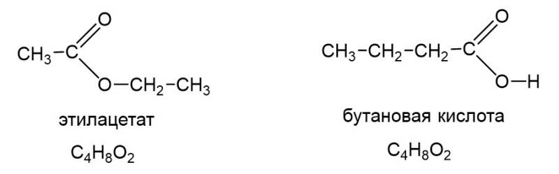 Наконец есть еще важный тип изомерии, знание которого часто проверяется в тестовой части ЕГЭ. Это межклассовая изомерия. У сложных эфиров есть межклассовые изомеры, а именно карбоновые кислоты. «Межклассовый» означает, что сложные эфиры и карбоновые кислоты относятся к разным классам органических соединений, но имеют одинаковую формулу гомологического ряда, а именно CnH2nO2. Ниже в качестве примера показаны этилацетат и бутановая кислота:
