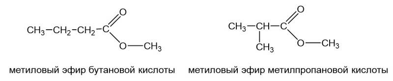 Понятно, что если радикалы R1 и R2 (см. самый первый рисунок) в сложном эфире достаточно длинные, то они могут давать изомерию углеродного скелета. То есть может метиловый эфир бутановой кислоты и метиловый эфир метилпропановой кислоты.