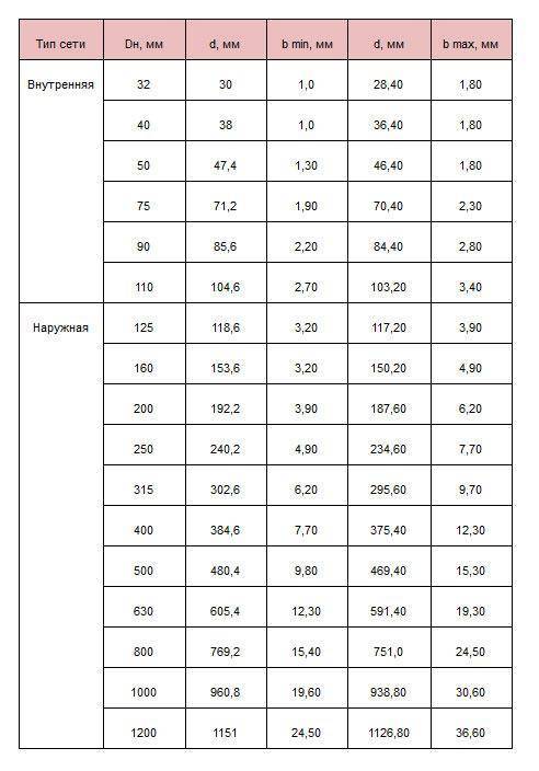 В таблице приведены стандартные размеры ПВХ труб для внутренней и внешней канализации: