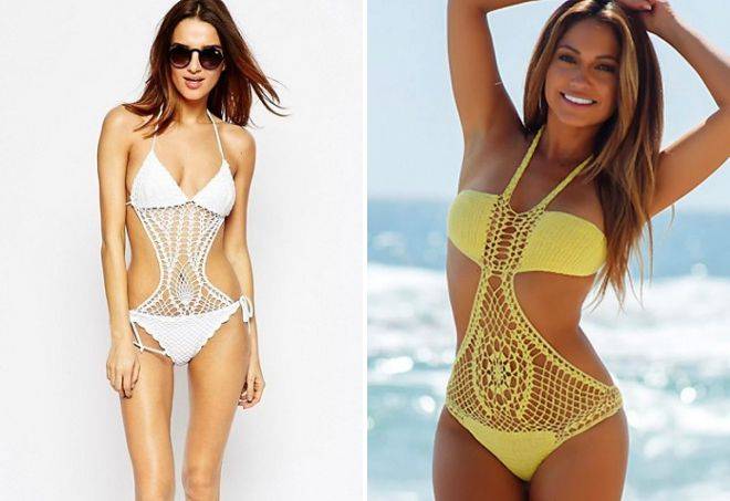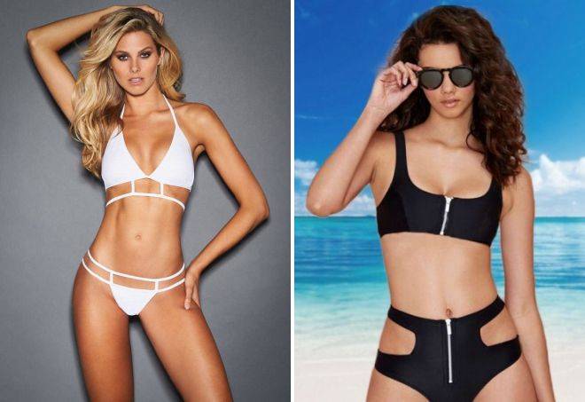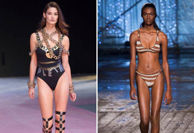 Модными в этом сезоне стали слитные модели, верх и низ в которых соединяется тонкими лямками, тесемками, кружевом и цепочками. Низ купальника имеет тонкие веревочки на бедрах и небольшие треугольники ткани на паховой зоне и на ягодицах.