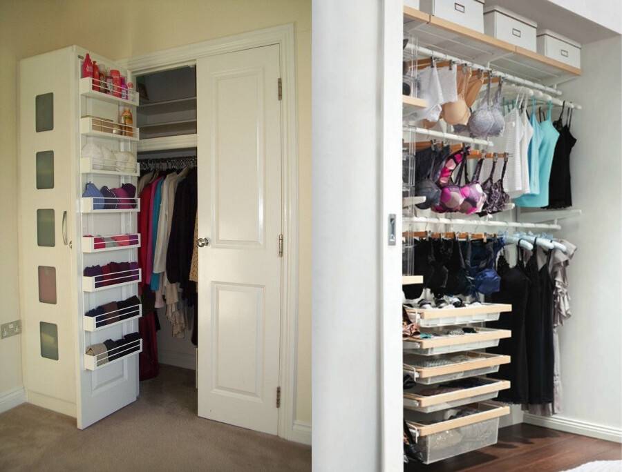 Если ты располагаешь большим шкафом или гардеробной, то на дверь можно прикрепить несколько узких полочек. На них можно хранить любое бельё, которое захочешь.