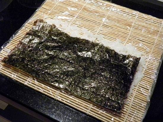- Теперь запоминаем правило: тонким слоем выкладываем рис, а затем лист нори. Рис должен на 1 см превышать размеры водорослей.