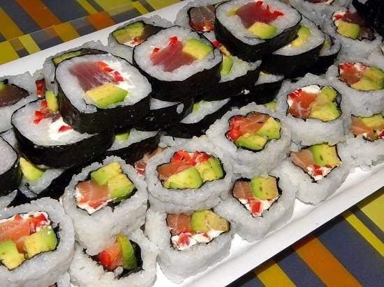 Роллы – это разновидность суши в форме рулета. Их основные ингредиенты те же: рис и морепродукты, завернутые в лист нори. Но в роллы можно добавить еще фрукты и овощи, например, огурец или авокадо. Именно роллы с огурцом принято подавать в Японии в торжественных случаях. Вообще-то ассортимент роллов, которые в сейчас подают в суши-барах, за последнее время сильно изменился. Фантазия кулинаров не знает границ, и сегодня можно увидеть и попробовать роллы разных форм и размеров, украшенные изображениями животных, растений. Наполнителями для них становятся различные сорта рыбы, водоросли, овощи. Даже основной ингредиент – рис – подкрашивают специальными добавками (к примеру, красной икрой).