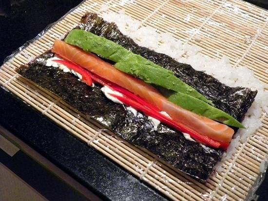 - Берут листья нори, кладут на него рис и выбранную заранее начинку;