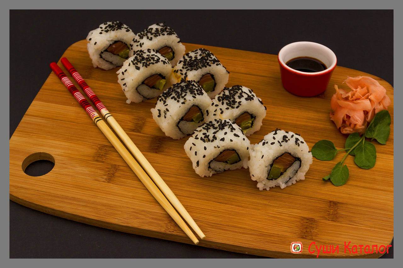 Для изготовления суши используют семгу или тунца, копченого угря, креветок и осьминогов.
