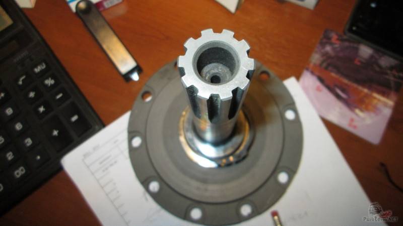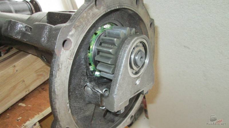 - Большая ведомая шестерня в продольной плоскости находится в сцеплении с главной шестерней. В нее встроен дифференциал из 4 сателлитов.