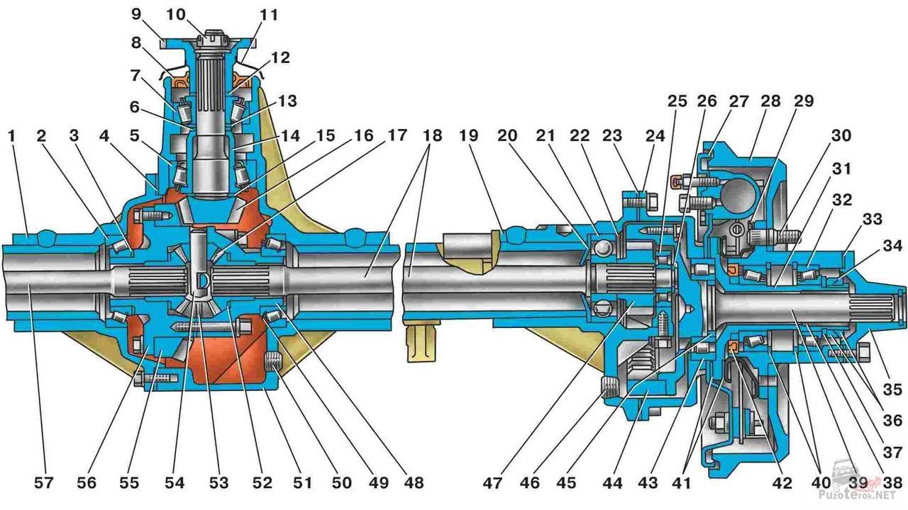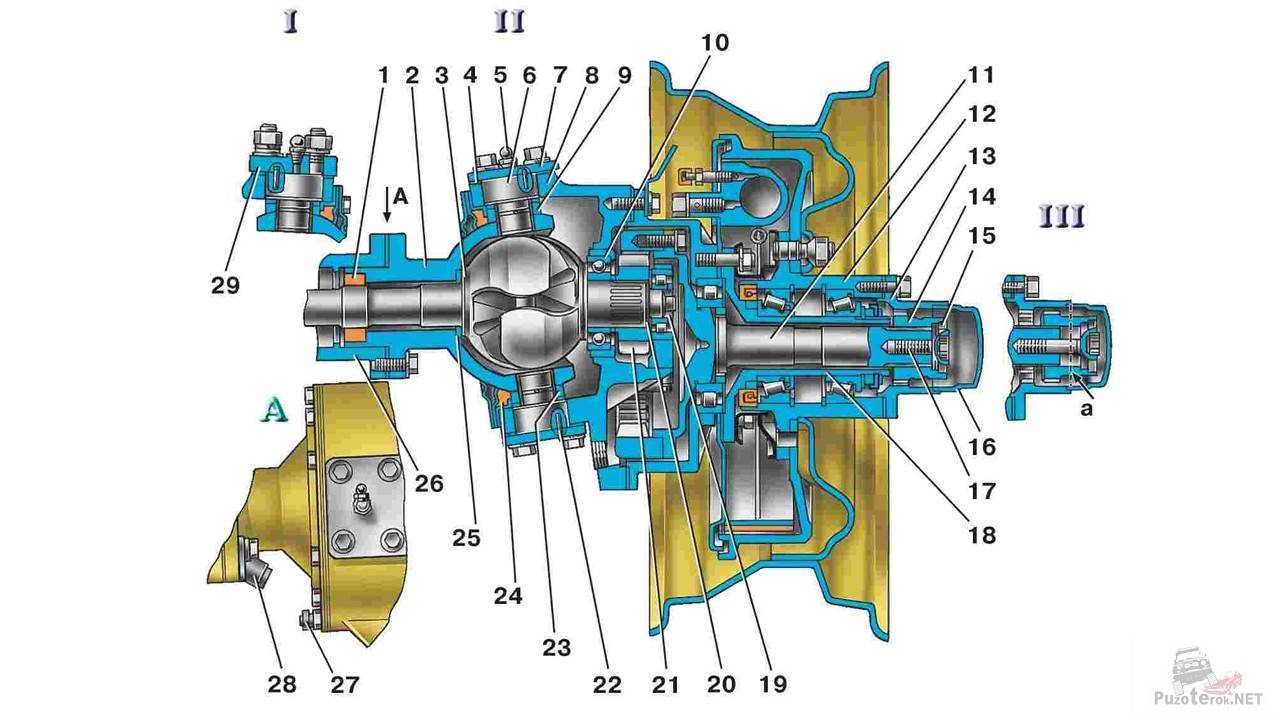 Конструкция старого образца во многом похожа на устройство заднего моста УАЗ и состоит из следующих компонентов: