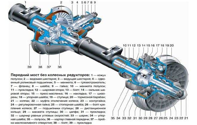 Рассматриваемые мосты также именуются «гражданскими». Данные конструкции обеспечивают передачу крутящего момента посредством дифференциала и полуоси прямо на ступицы колес. «Колхозные» мосты характеризуются: