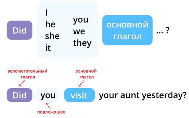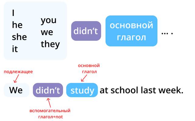 | Строятся по формуле: подлежащее + глагол с окончанием «ed»\вторая форма из таблицы «неправильный глаголов». | Можно составить по схеме: вспомогательный глагол «did» + подлежащее + смысловой глагол. | Образование отрицания происходит с помощью отрицательной частицы «not». То есть: подлежащее + глагол из класса вспомогательных «did» + отрицательная частица «not» + смысловой глагол. |