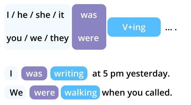Для утверждения предложение в Past Continuous состоит из вспомогательного глагола и основного. Для образования используется to be в прошедшем времени — то есть was и were. Первый используется в единственном числе, а второй — во множественном. Для основного глагола действует следующее правило: частица to убирается, а в конце добавляется окончание -ing.