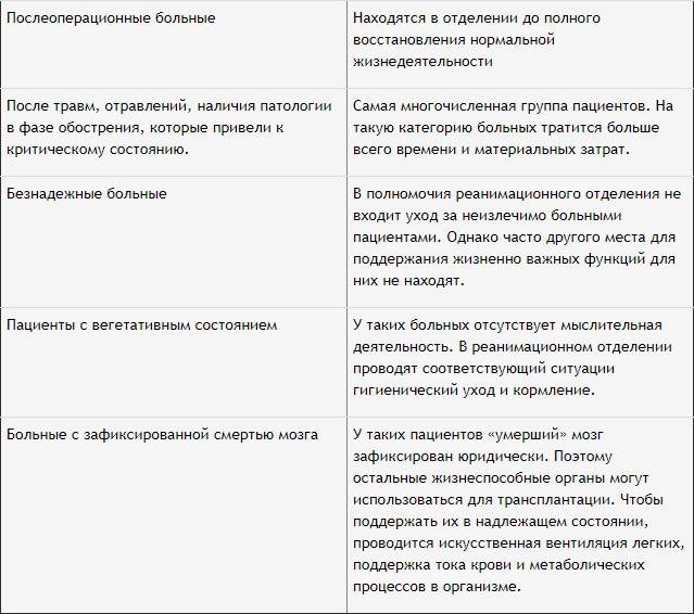 В реанимацию чаще всего попадают пациенты с острыми состояниями, такими как сердечно-сосудистые происшествия, травмы с тяжелыми осложнениями, сепсис, отравления и т.д. Важным отличием реанимации от интенсивной палаты является то, что первая ориентирована на мгновенную помощь в критической ситуации, а вторая на обеспечение постоянных мероприятий по поддержанию пациента. Также стоит отметить, что в реанимации осуществляется непрерывный мониторинг состояния пациента при помощи специального оборудования.