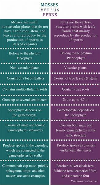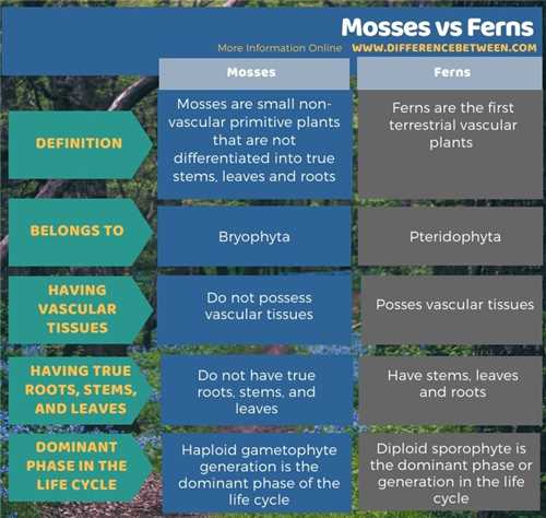 Приведенная ниже инфографика суммирует разницу между мхами и папоротниками..