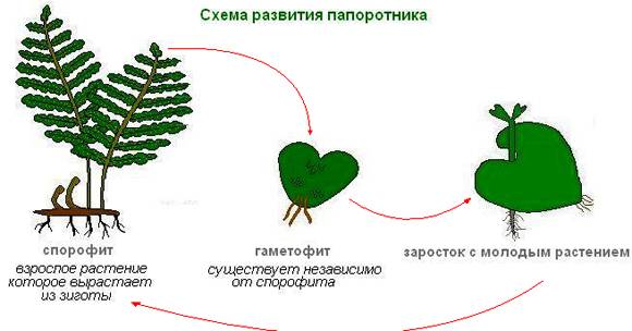 Из споры вырастает крошечное растеньице, в виде сердцевидной, прижатой к земле пластиночки. Это – заросток. У него есть ризоиды; на нижней стороне образуются антеридии и архегонии. Оплодотворение происходит как и у мохообразных. Из зиготы развивается зародыш, а потом и молодое растение папоротника.