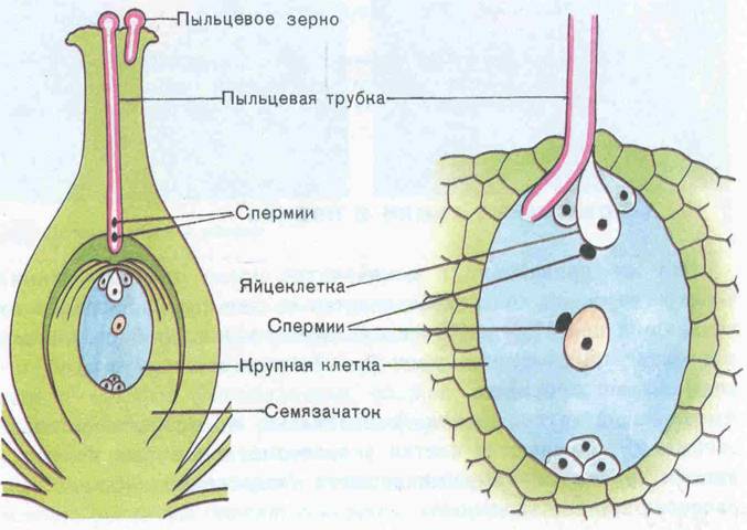 . Здесь уже мужские клетки – пыльца, попадая на женские – пестик прорастают в спермии, которые по специальной пыльцевой трубке уже далее целенаправленно двигаются к семязачатку. Попадая в область зародышевого мешка, один спермий дает жизнь новому растению, другой становится основой для эндоспермы – запаса необходимых питательных веществ.