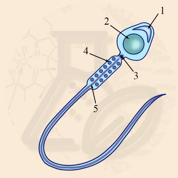 Рис. Строение сперматозоида: 1 – акросома, 2 – ядро, 3 – центриоль, 4 – митохондрии, 5 – аксонема, образованная дистальной центриолью – основа жгутика.