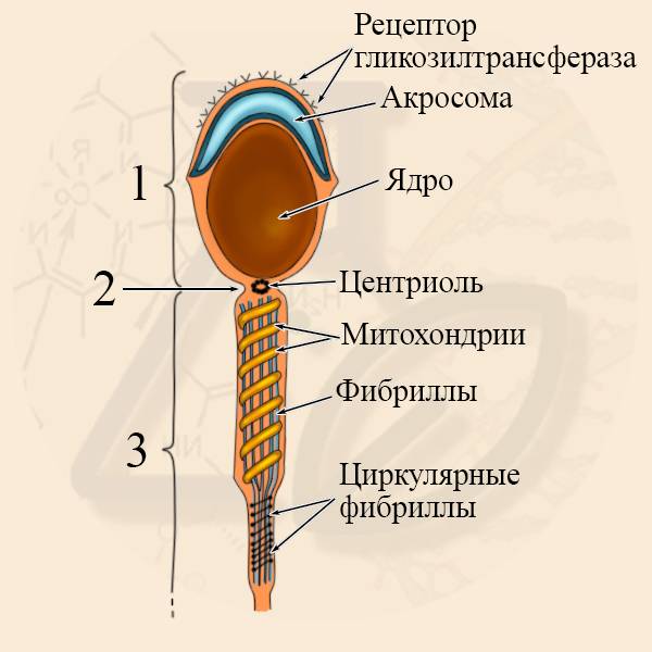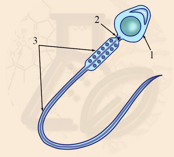 Рис. Строение сперматозоида: 1 – головка, 2 – шейка, 3 – хвост.