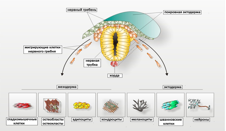 Схема зародыша позвоночного на стадии миграции клеток нервного гребня (поперечный разрез). Внизу в условных областях, принадлежащих эктодерме и мезодерме, показаны типы клеток, которые могут дифференцироваться не из этих тканей, а из нервного гребня. Остеобласты и остеокласты — клетки кости, хондроциты — клетки хряща; остальные пояснения см. в тексте. Изображение с сайта web.biologie.uni-bielefeld.de (с изменениями)