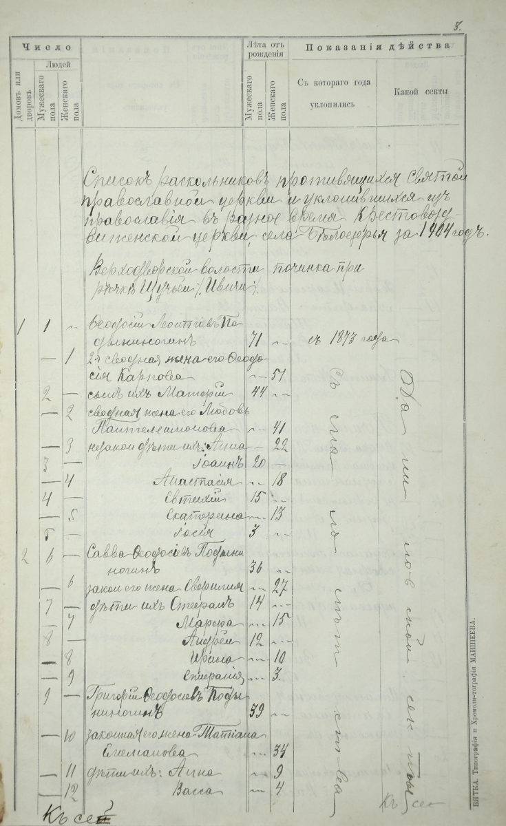 Список раскольников Даниловской беспоповской секты 1904 года Вятская губерния. Старообрядцы Орловского уезда. Источник ГАКО