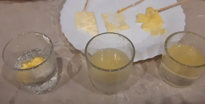 Настоящий продукт в горячей воде растворяется равномерно, а маргарин распадется на кусочки. На высококачественном продукте при 20-градусной температуре не выступает вода. Наличие капель воды указывает на то, что в продукте есть маргарин.