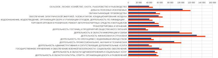 Номинальная зарплата на конец 2021 (синяя полоса) и 2022 (красная полоса) годов