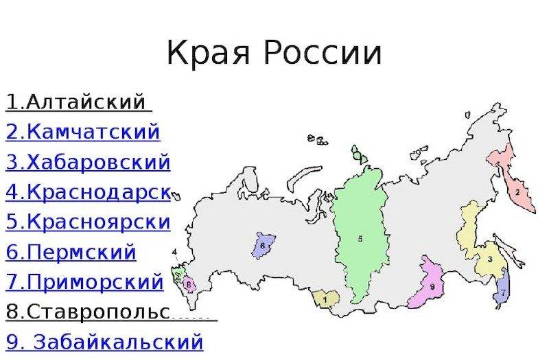 Край – это административно-территориальная единица, расположенная на краю страны или территории, примыкающая к границе. Всего в России существует 9 краев. Основные отличительные черты края: