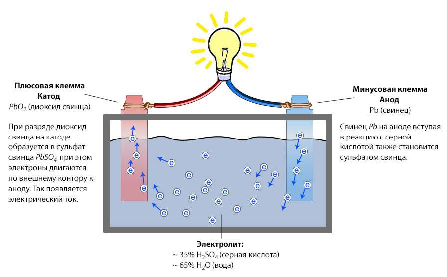 Во время разрядки батареи ионы водорода образуются на отрицательной пластине, и эти ионы переходят в раствор электролита и расходуются на положительной пластине. Ионы HSO4 расходуются на обеих пластинах. В процессе зарядки происходит обратная реакция.