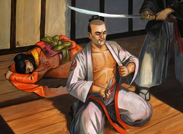 феодал Минамото но-Тамэтомо: из-за проигранной войны с кланом Тайра самурай вспорол живот, не желая попасть в плен. Так он сохранил воинскую честь.