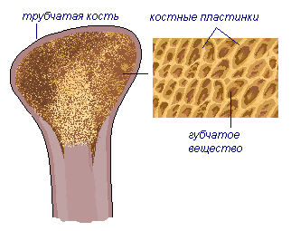 Концы длинных костей содержат губчатое костное вещество. Оно также состоит из костных пластинок, образующих множество перекрещенных перегородок. В местах, где кость подвержена наибольшей механической нагрузке, количество этих перегородок самое высокое. В губчатом веществе находится красный костный мозг, клетки которого дают начало клеткам крови. Короткие и плоские кости тоже имеют губчатое строение, только с наружи они покрыты слоем плотинного вещества. Губчатое строение придаёт костям прочность и лёгкость.