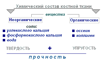 Основу этой ткани составляют органические вещества. Они придают костям упругость. В основном это эластичный белок коллаген. Прочность костной ткани определяется количеством неорганических веществ, к которым относятся кальций и фосфор.