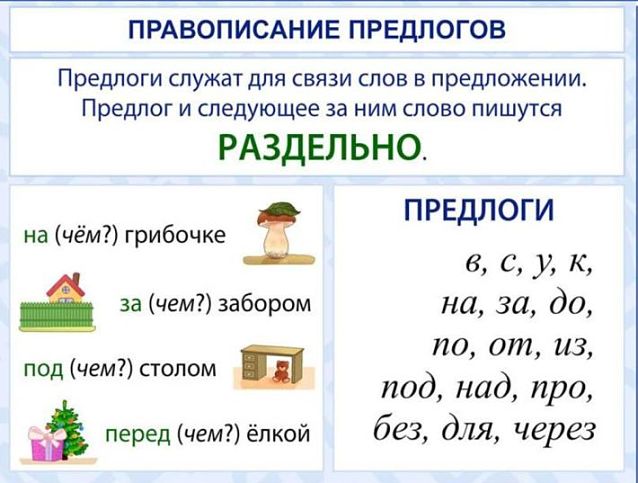Предлоги являются частью сказуемого и отвечают на вопросы «о ком?», «о чем?», «кому?», «кому-чему?», «кого?», «чего?», «ком?», «чем?», «в ком?», «в чем?», «на ком?», «на чем?». Предлоги образуют фразовые группы с другими словами, в которых при помощи падежных и предложных окончаний устанавливается их связь. Например: «в доме», «у друга», «с мамой».