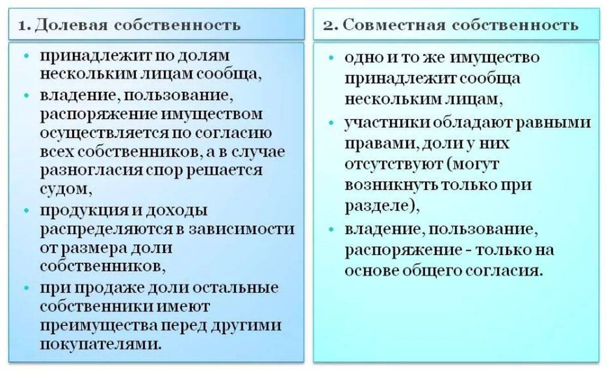 Характеристика долевой и совместной собственности позволяет лучше понять специфику имущественных режимов, выделить их общие черты и определить различия.