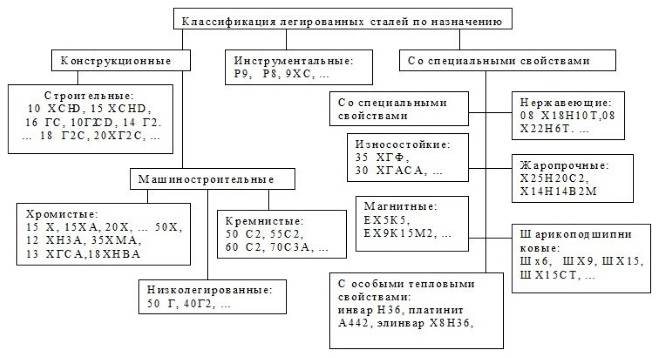 Классификация сталей осуществляется и по их назначению. Так, выделяют инструментальные и конструкционные виды, марки, отличающиеся особыми физическими свойствами. Инструментальные виды используются для производства штамповых, мерительных, а также режущих инструментов, конструкционные – для выпуска продукции, применяемой в строительстве и сфере машиностроения. Из сплавов, отличающихся особыми физическими свойствами (также называемых прецизионными), изготавливают изделия, которые должны обладать особыми характеристиками (магнитными, прочностными и др.).