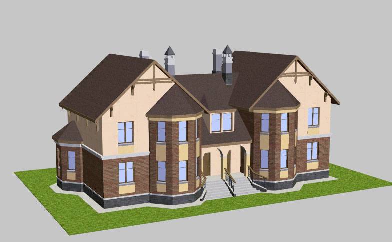 Предполагает наличие двух зеркальных совмещенных секций или блоков. Строения рассчитаны на две семьи, имеют одну общую перегородку, крышу. Часто планировка двух условно совмещенных домов идентичная. Для каждого владельца выделяется небольшой земельный участок.