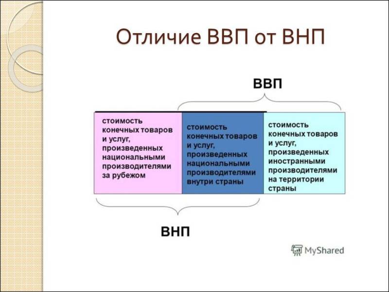 Итак, валовый национальный продукт, или ВНП, представляет собой суммарное количество экономических ресурсов, которые формируются гражданами конкретной страны. Если применяются ресурсы государства, но товар изготавливается в другой стране, речь идет о ВНП. Если же на территории рассматриваемого государства задействуются ресурсы другого государства, применяется термин валового внутреннего продукта.