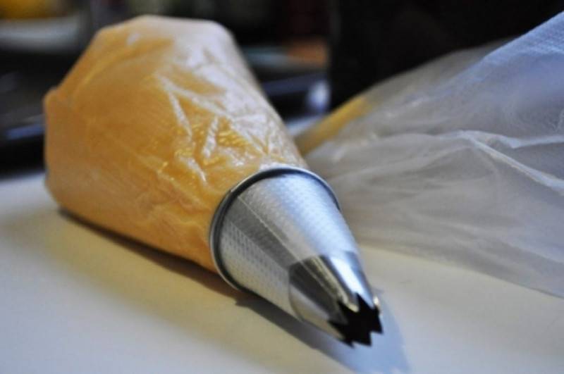 Если вы нечасто готовите выпечку, то нет необходимости покупать специальное приспособление. Кондитерский шприц (мешок) просто сделать самим. Берем пакет от майонеза с дозатором, отрезаем дно и хорошенько промываем внутри. Затем наполняем кремом и приступаем украшать сладости!
